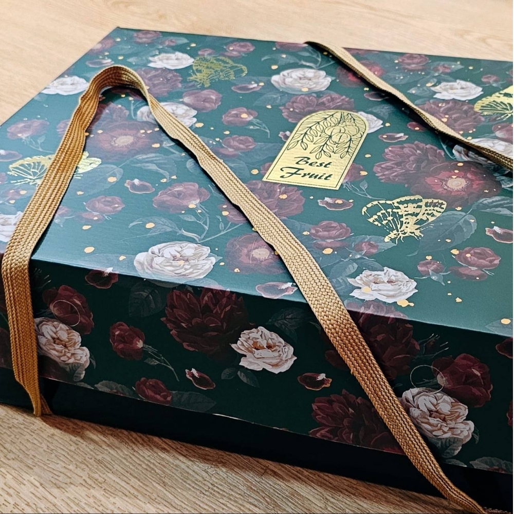 典雅的墨綠底色,點綴著代表大自然的豐收與餽贈的燙金蝴蝶,顆顆蔬果網包裹、原裝箱さんふじ貼紙、每盒皆使用外箱保護,避免宅配單或任何搬運擦傷風險,將您送禮的心意,完整且用心的傳遞給您重要的貴賓。
