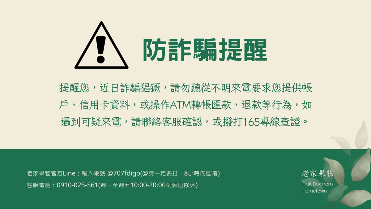 如接獲不明及可疑的電話或簡訊提出上述要求時,請勿提供任何資料,立即撥打165反詐騙專線,或聯繫老家果物諮詢查證