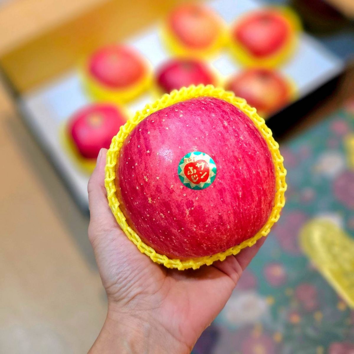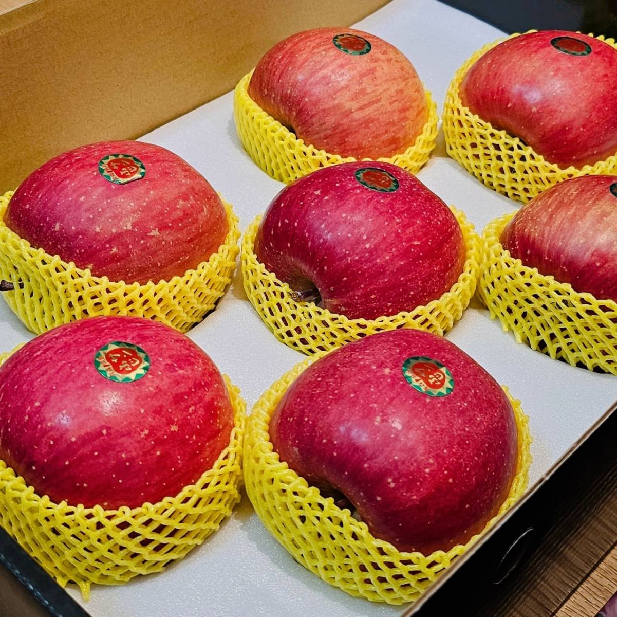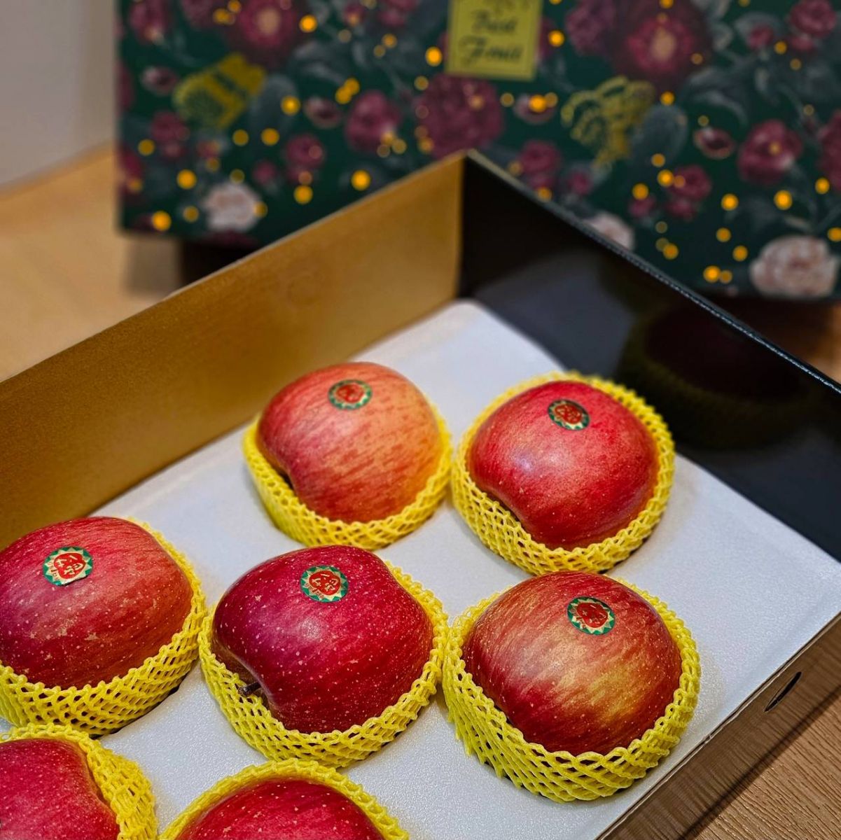 富士蘋果個頭大、形狀圓潤,外皮多為鮮紅色,並帶有褐紅色條紋,看起來討喜且高雅,非常適合作為伴手禮或節慶禮盒。