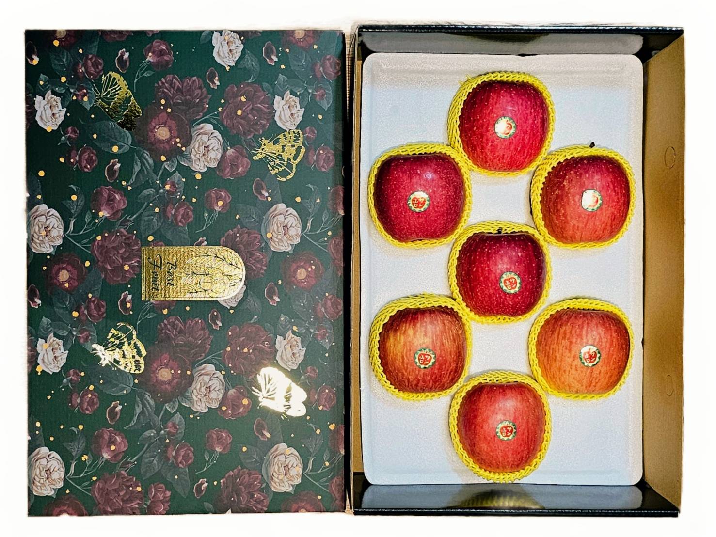 典雅的墨綠底色,點綴著代表大自然的豐收與餽贈的燙金蝴蝶,顆顆蔬果網包裹、原裝箱さんふじ貼紙、每盒皆使用外箱保護,避免宅配單或任何搬運擦傷風險,將您送禮的心意,完整且用心的傳遞給您重要的貴賓。